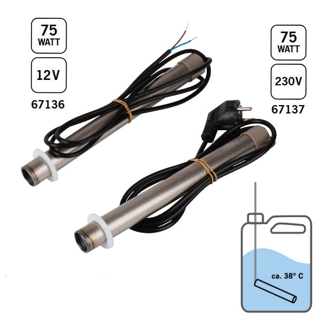 Grzałka zapewnia stałą temperaturę wody wynoszącą 38°C. Grzałkę umieszcza się w kanistrze i zasila napięciem 12 V. Długość grzałki: 25 cm, średnica: 2,2 cm, kabel przyłączeniowy ok. 100 cm z 2 otwartymi końcówkami.