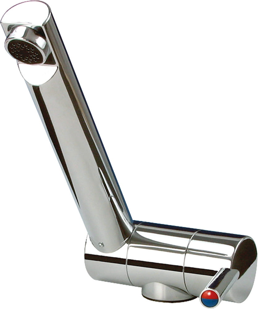 Trend Designerska bateria z przełącznikiem i pionową obrotową wylewką. Niska wysokość montażowa 4 cm do instalacji w zlewozmywakach ze szklanym blatem.
