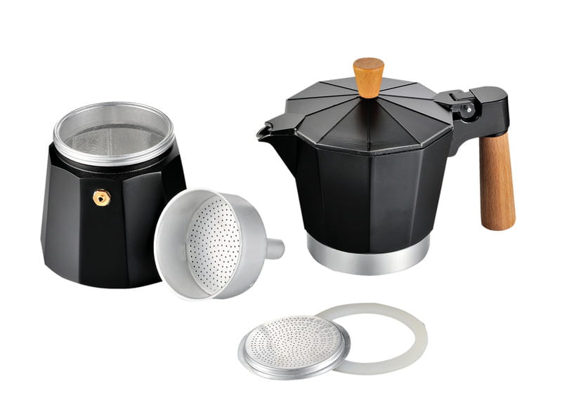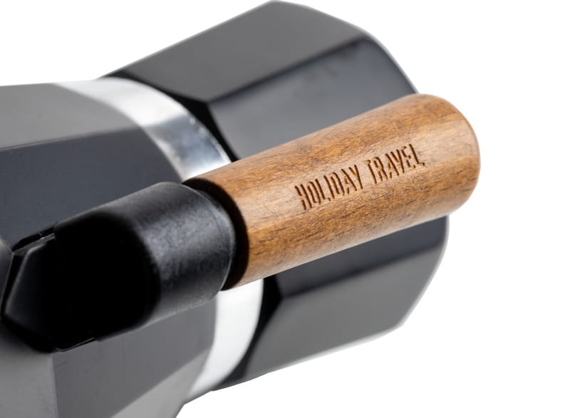 Ekspres do kawy HOLIDAY TRAVEL posiada drewnianą rączkę i drewniane pokrętło.