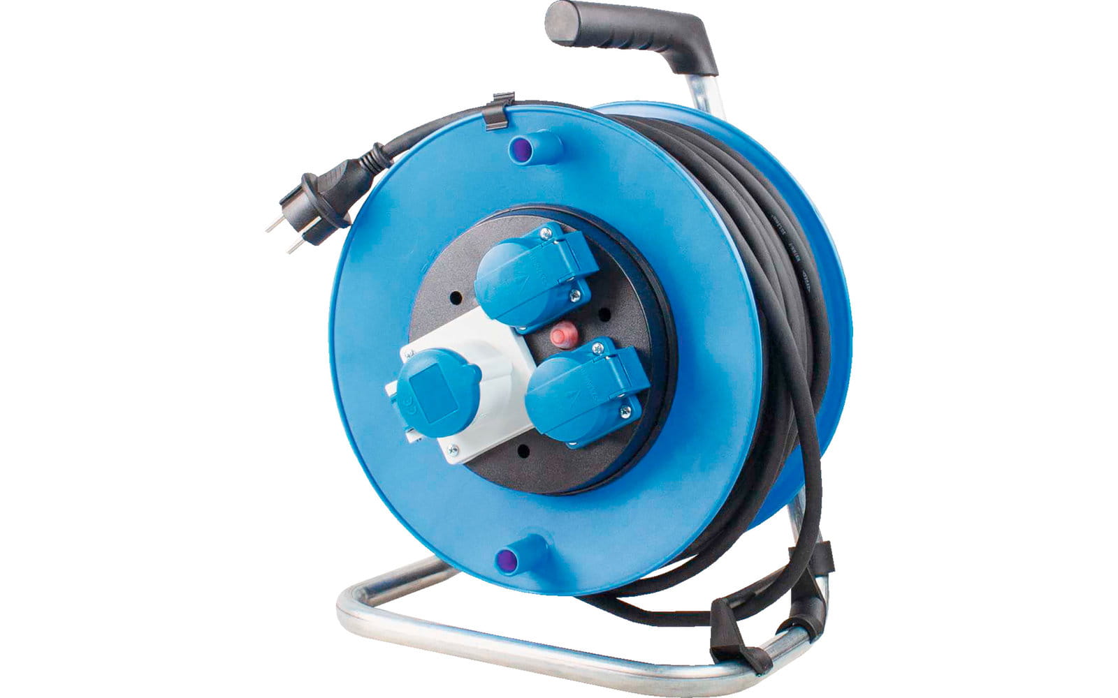 Przedłużacz na bębnie 285 mmØ. Do stałego stosowania na zewnątrz. Z przewodem gumowym H07RN-F 3G2,5 o długości 25 m. Dodatkową ochronę zapewnia ochronna wtyczka stykowa i wyłącznik termiczny. Z ocynkowaną podstawą z profilowanym uchwytem, hamulcem ustalającym i prowadnicą kabla 230V/16A/max. 3500W. Przedłużacz kablowy posiada 2 wbudowane gniazda 230V / 16A z pokrywą uchylną i 1 gniazdo CEE 230V / 16 A / 3-biegunowe.