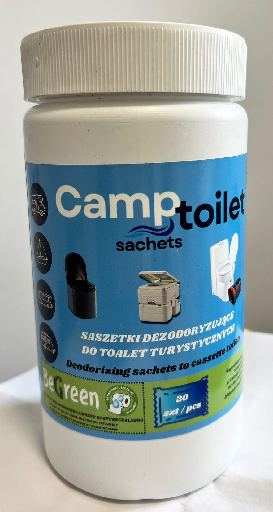 Wygodne w użyciu, wodo rozpuszczalne saszetki do toalet turystycznych.