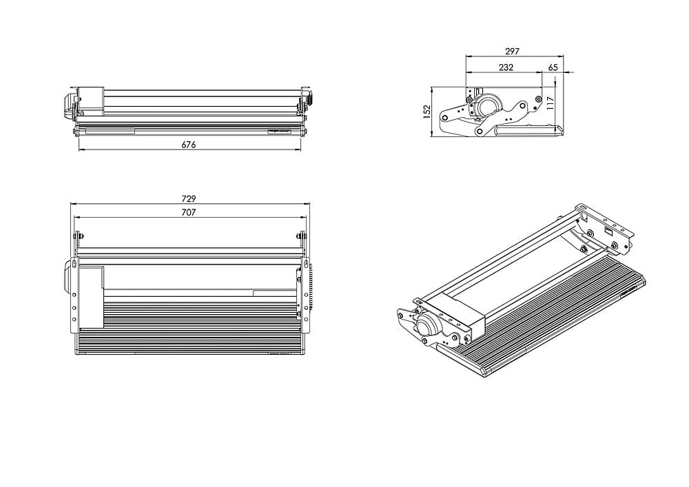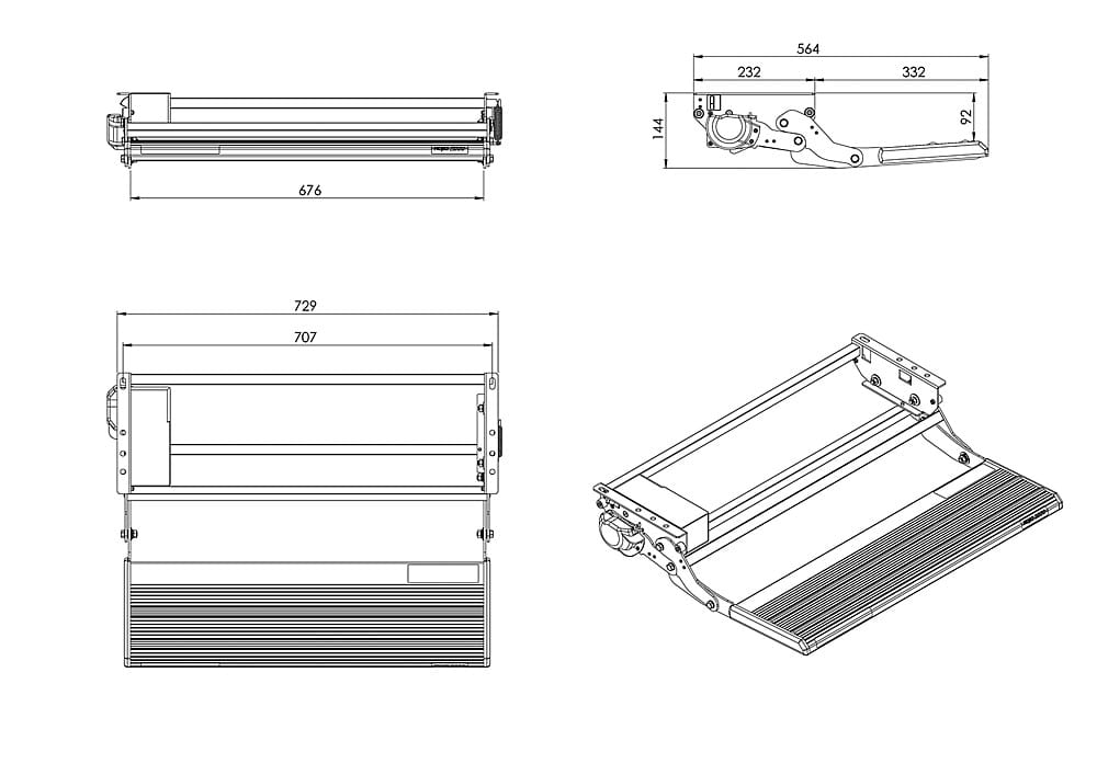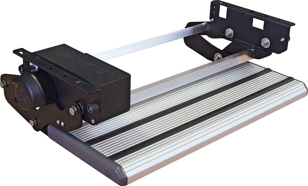 Stopnie z ruchem wahadłowym do bezpośredniego montażu na pojeździe. Stopień z anodowanego aluminium, antypoślizgowy. Konstrukcja stalowa ocynkowana. Przekładnia silnika na łożysku kulkowym. Sygnalizacja LED, gdy stopień jest otwarty. Szybki ruch na mosiężnych tulejach. Otwieranie i zamykanie przez naciśnięcie przełącznika aż do całkowitego wejścia lub wyjścia. Elektroniczne zabezpieczenie, które aktywuje się w przypadku przeciążenia stopnia.