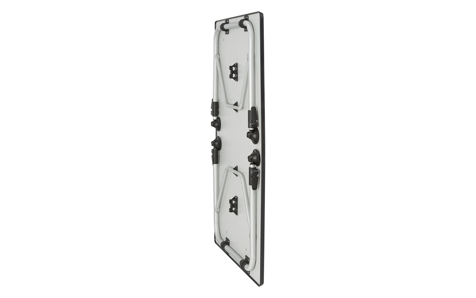 Szczególnie wytrzymały stół aluminiowy z blatem z MDF odpornym na warunki atmosferyczne i ciepło.