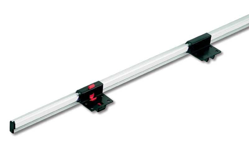 Anodowane aluminium z srebrno-szarą lamówką. Zestaw: szyna 1000 mm z zaślepkami (do montażu na ścianie) i 2 wiszącymi elementami (do przykręcenia do blatu stołu)