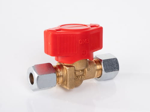 Standardowy zawór odcinający z szybkim zamknięciem, z dwustronnym złączem śrubowym z pierścieniem tnącym 8 mm.