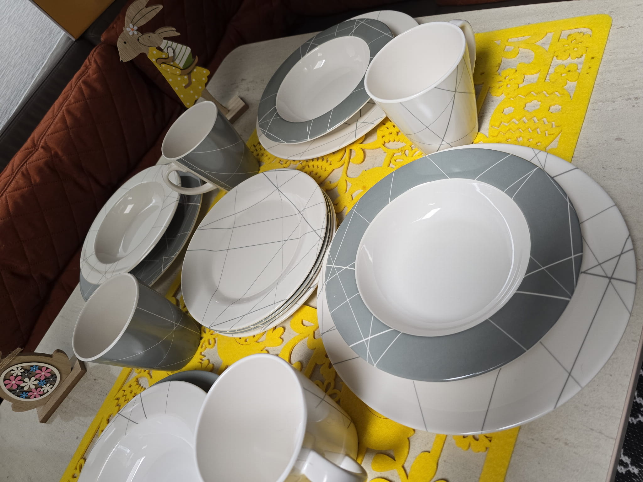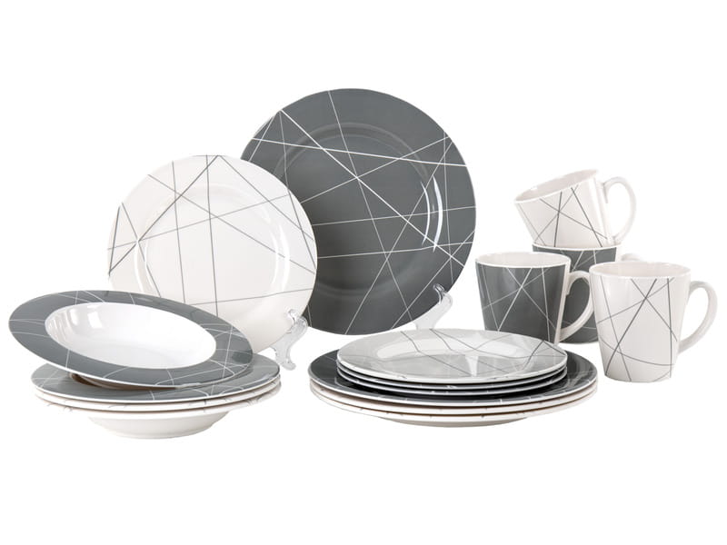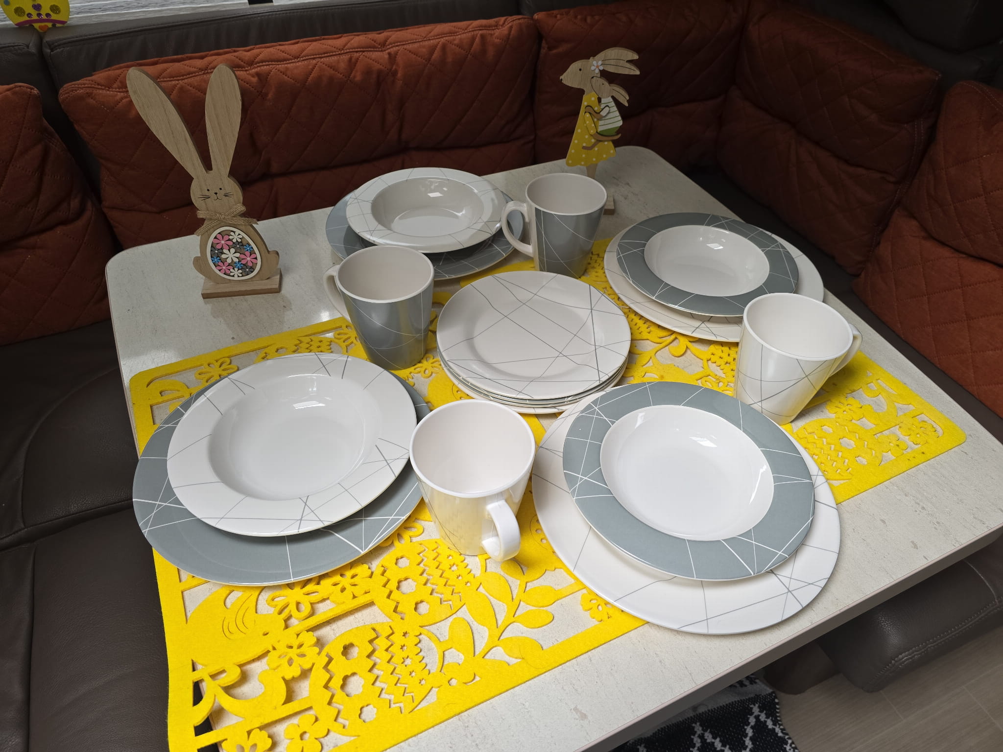 Wymiary talerza deserowego: Ø 20 cm Wymiary talerza obiadowego: Ø 25,5 cm Wymiary talerza na zupę: Ø 21 cm, wysokość 3,5 cm Wymiary kubka: Ø 6/9 cm, wysokość 10 cm, pojemność 350 ml